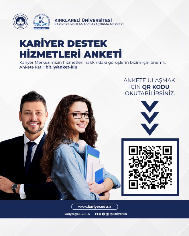 Üniversitemiz Kariyer Uygulama ve Araştırma Merkezi tarafından, kalite geliştirme faaliyetleri kapsamında “Kariyer Destek Hizmetleri Memnuniyet Anketi” hazırlanmıştır.